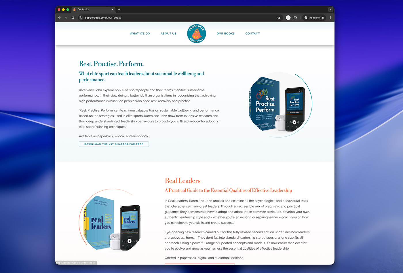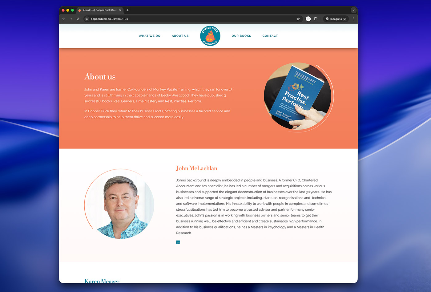 Copper Duck Consulting is a second site for an existing client, built to sit alongside Copper Duck Interiors while serving a different purpose. The goal was to keep the brand tied together, so the consulting site uses the same core colour palette, typography, and overall structure as the interiors website, but with a lighter, slightly more playful feel to suit a more conversational tone.