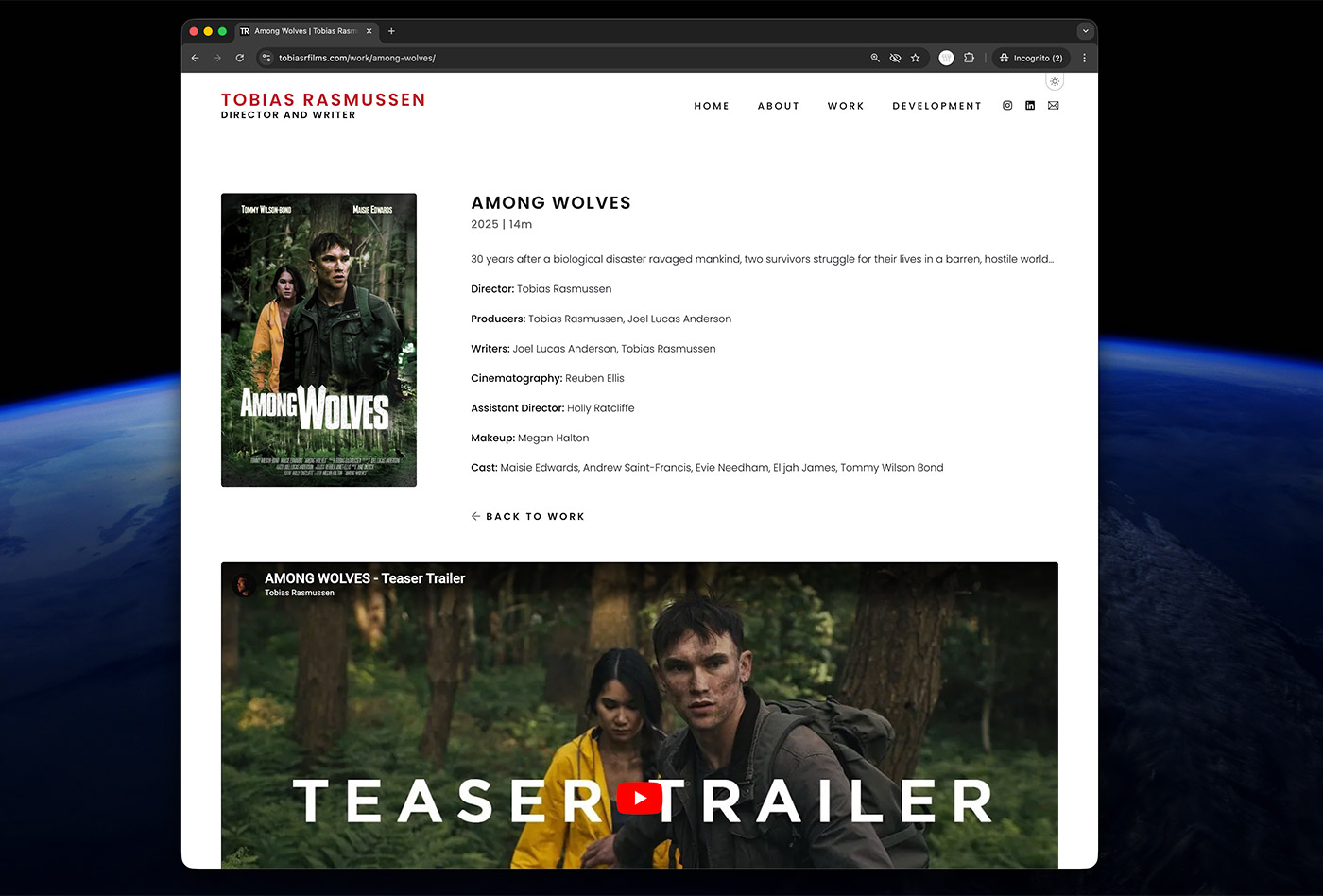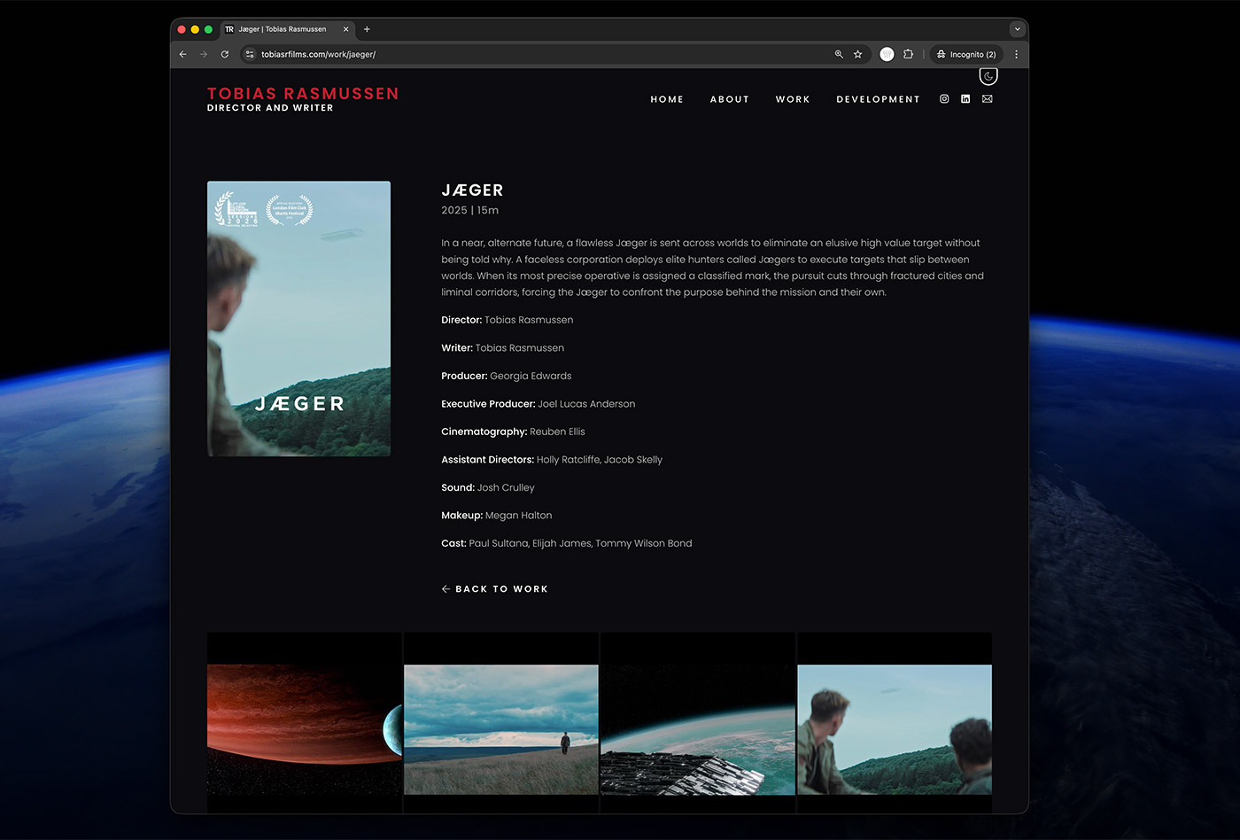 Under the hood, Bricks powers a modular system that mirrors the clarity of the design. Custom post types structure productions, credits, and metadata so Tobias can update everything himself, while a numeric display order keeps the lineup precise. Reusable templates, tidy query loops, and site‑wide styles keep the build lean and consistent. The result is a portfolio that reflects the craft of the films it showcases – calm, precise, and quietly confident.