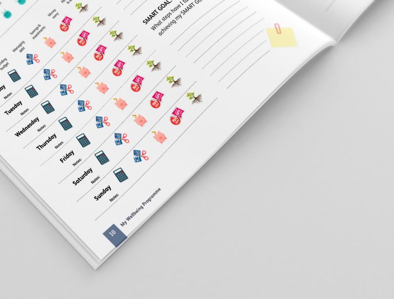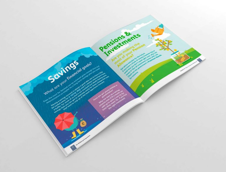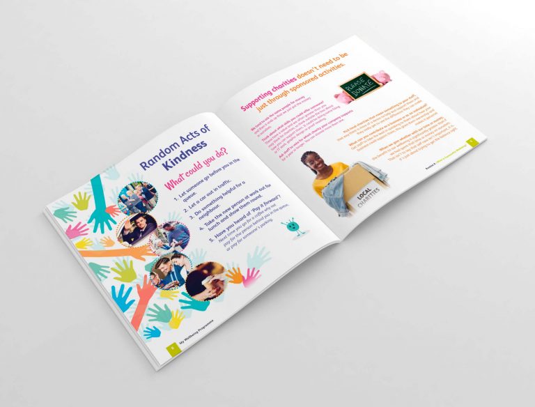 Infinite Wellbeing is a Bath based consultancy, specialising in maximising employee happiness and wellbeing. DW Multimedia was commissioned to design a series of ten, 16 page booklets dedicated to assisting employers and employees get the most out of their time at work. The project brief was to create interactive booklets that where full of colour, approachable, easy to digest and above all ‘fun’. The project required some bespoke illustrations from DW Multimedia as well as use of stock photography and included bespoke icon design and character illustration. The final 10 booklets were then presented to each employee in a custom designed ring binder.